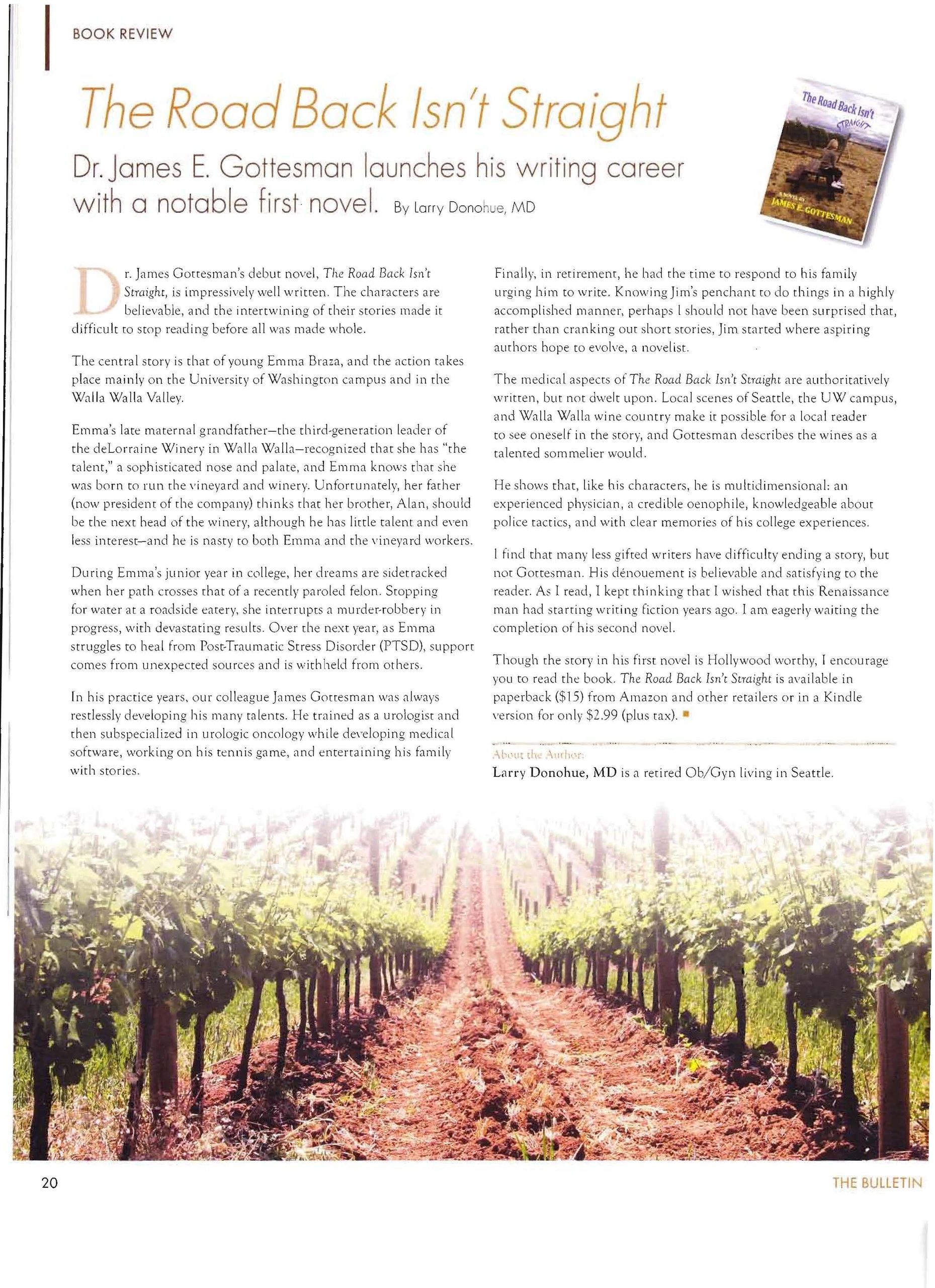 The medical aspects of The Road Back Isn’t Straightare authoritatively written, but not dwelt upon. Local scenes of Seattle, the UW campus, and Walla Walla wine country make it possible for a local reader to see oneself in the story, and Gottesman describes the wines as a talented sommelier would.